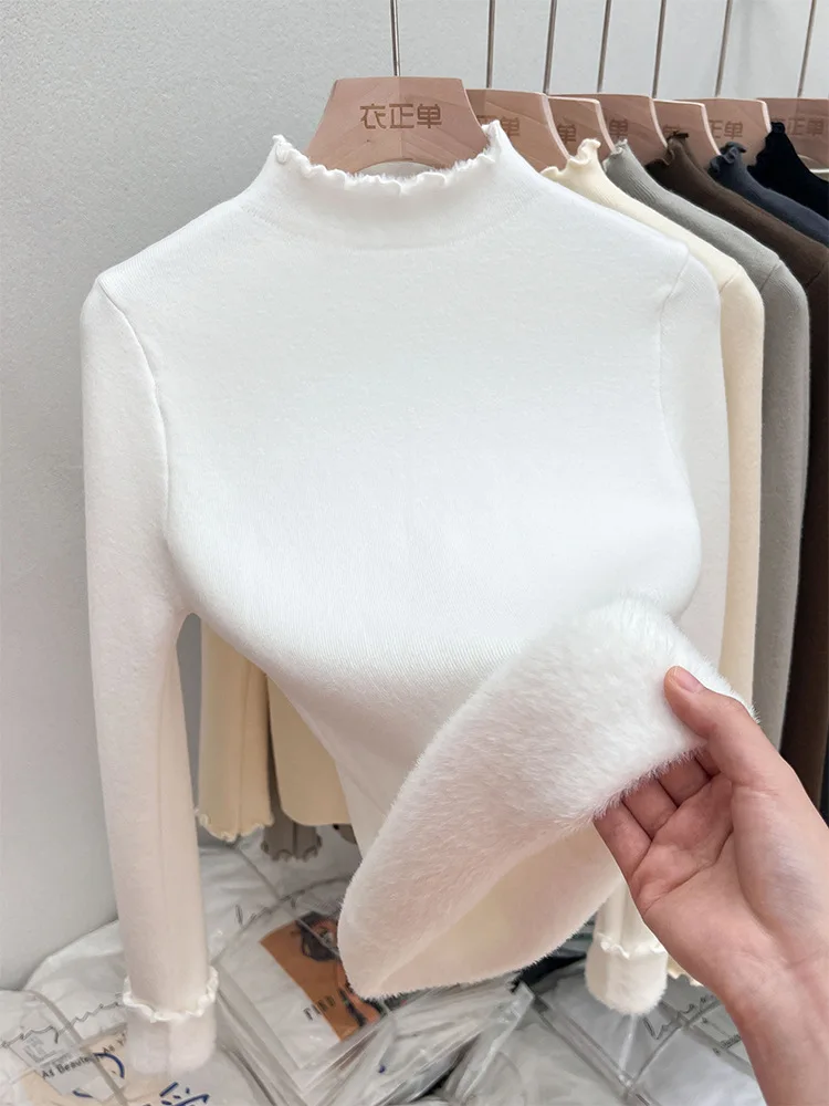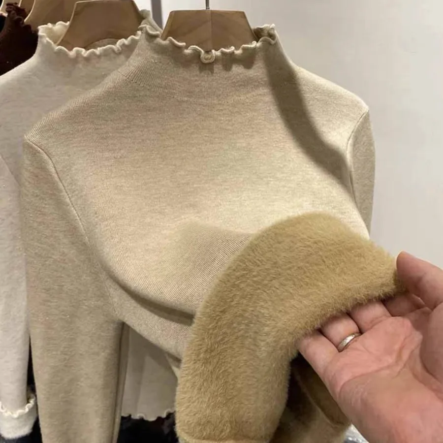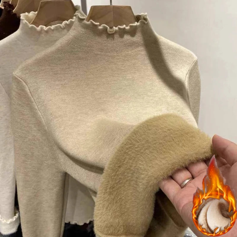 New Fleece Lined Thick Turtleneck Sweaters Women's Autumn Winter Slim Warm Ruched Knitted Tops Solid Color Casual Soft Pullover
