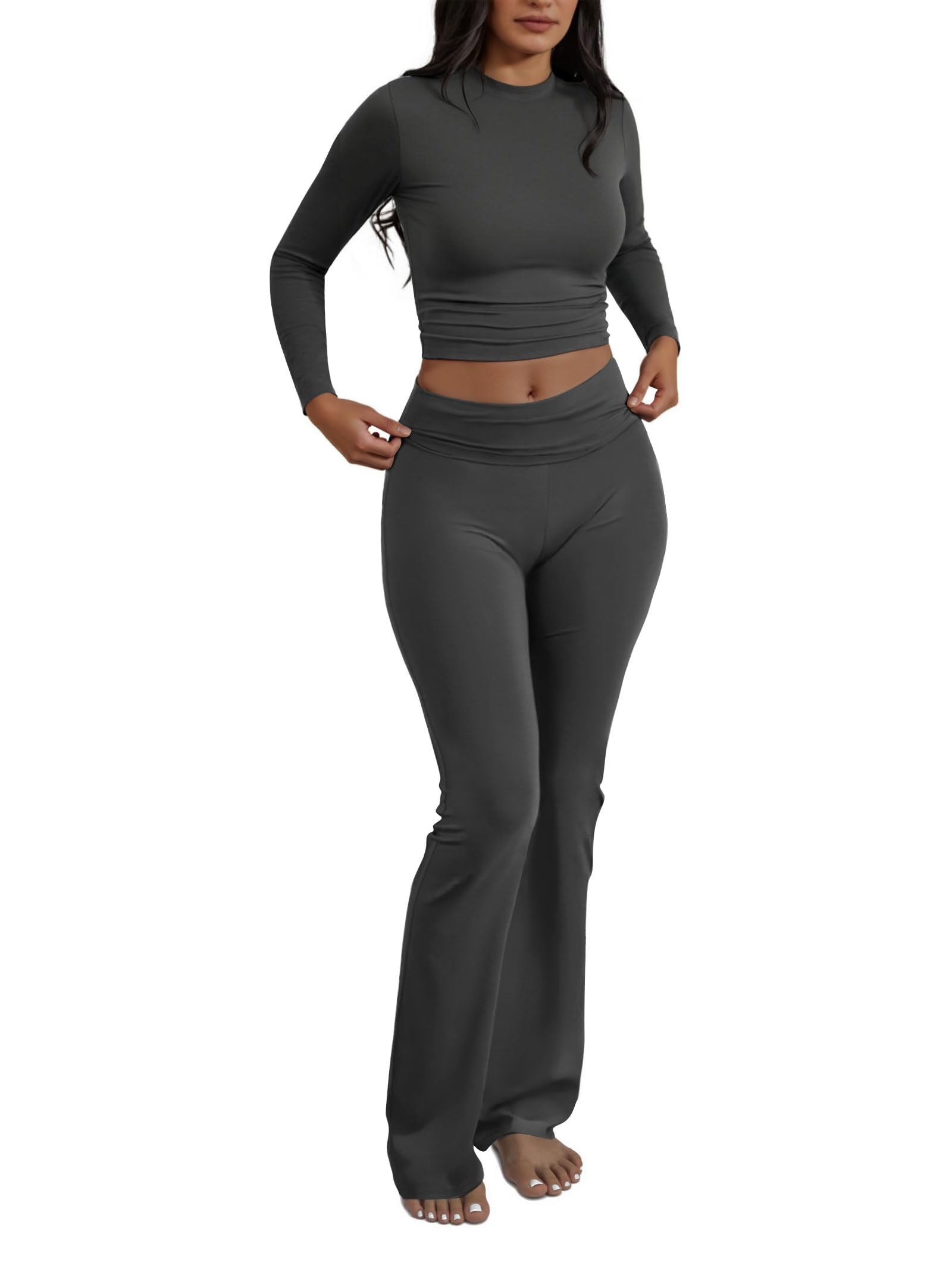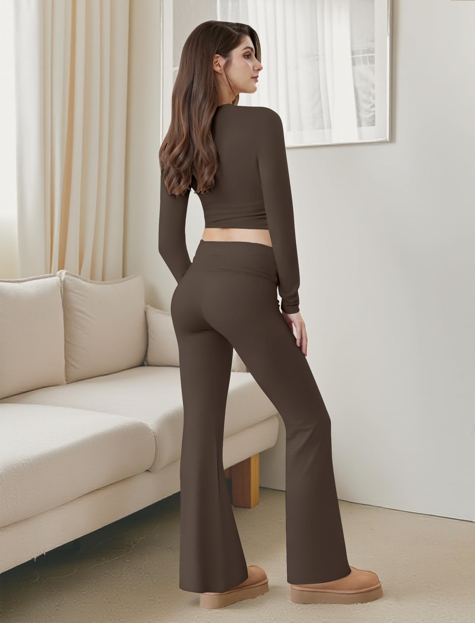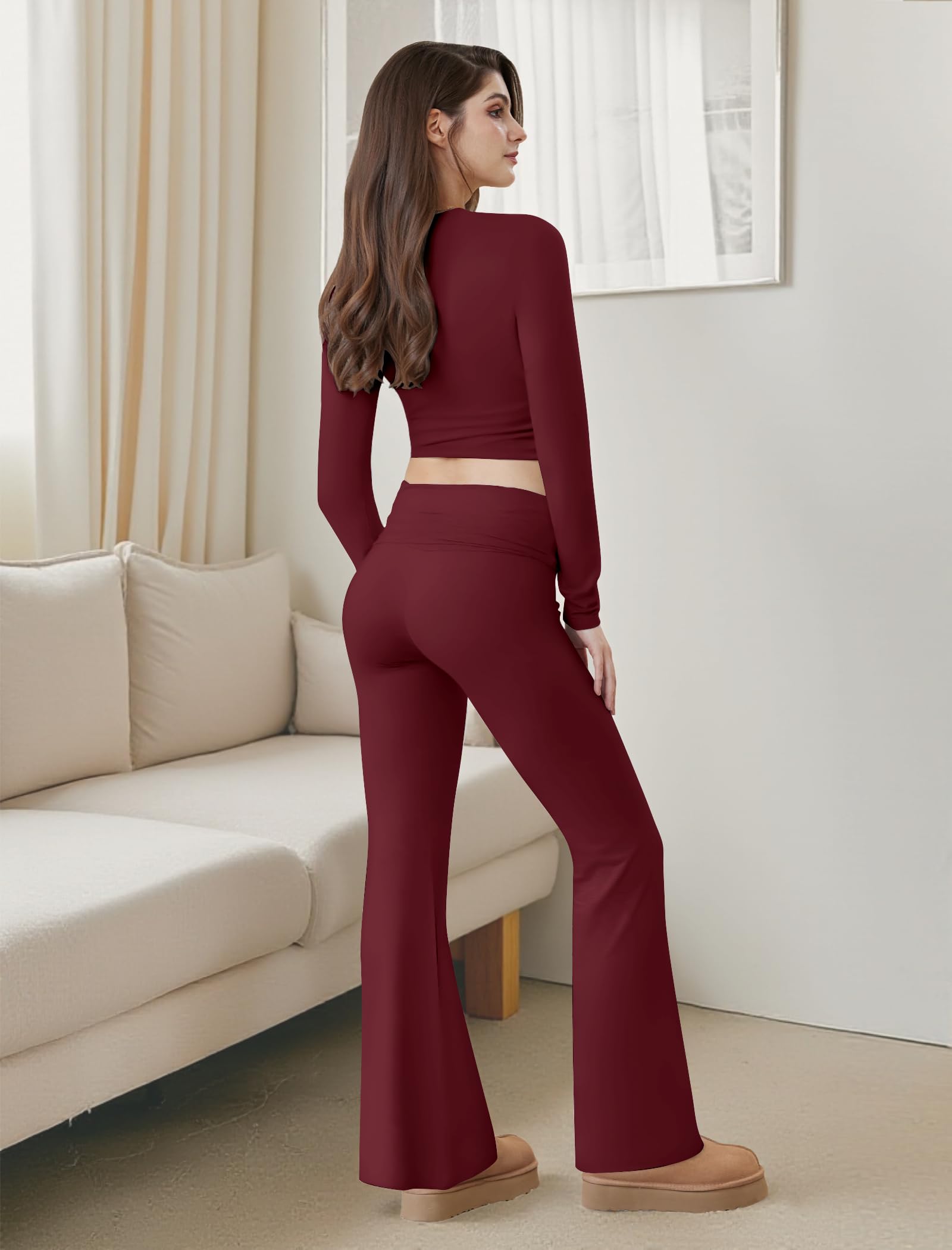 Two Piece Lounge Sets for Women Fold Over Flare Leggings Long Sleeve Crop Tops Matching Set Casual Y2k Outfits